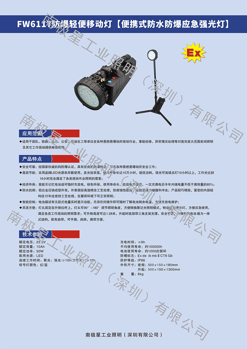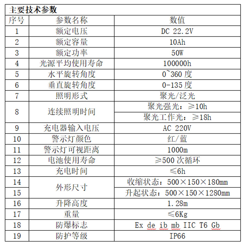 额定电压::DC22.2V 额定容量::10Ah 额定功率::50瓦 强光聚光放电时间::≥10小时 工作光聚光放电时间::≥18小时 防护等级::IP66 防爆标志::Ex de ib mb IICT6 Gb 重量::6千克 最大升起高度::1.28米