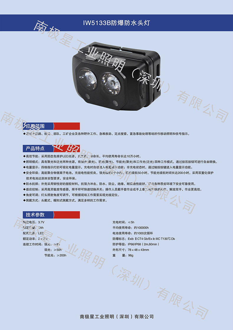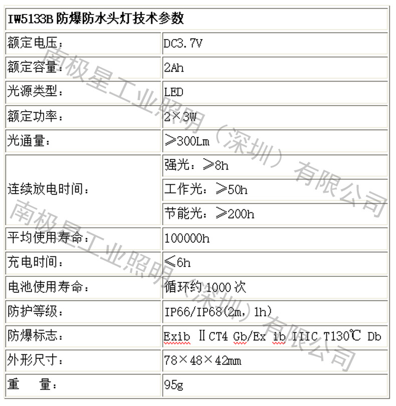 额定电压::DC3.7V 额定容量::2Ah 额定功率::2×3W 强光工作时间::≥8h 中光工作时间::≥50h 弱光工作时间::≥200h 防护等级::IP66/IP68(2m,60min) 防爆等级::Exib ⅡCT4 Gb/Ex ib IIIC T130℃ Db