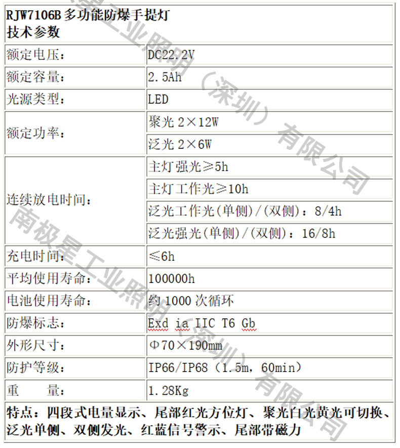 额定电压::DC22.2V 额定容量::2.5Ah 额定功率::聚光2×12W 额定功率::泛光2×6W 防爆标志::Exd ia IIC T6 Gb 外形尺寸::Φ70×190mm 防护等级::IP66/IP68(1.5m,60min) 重 量::1.28Kg