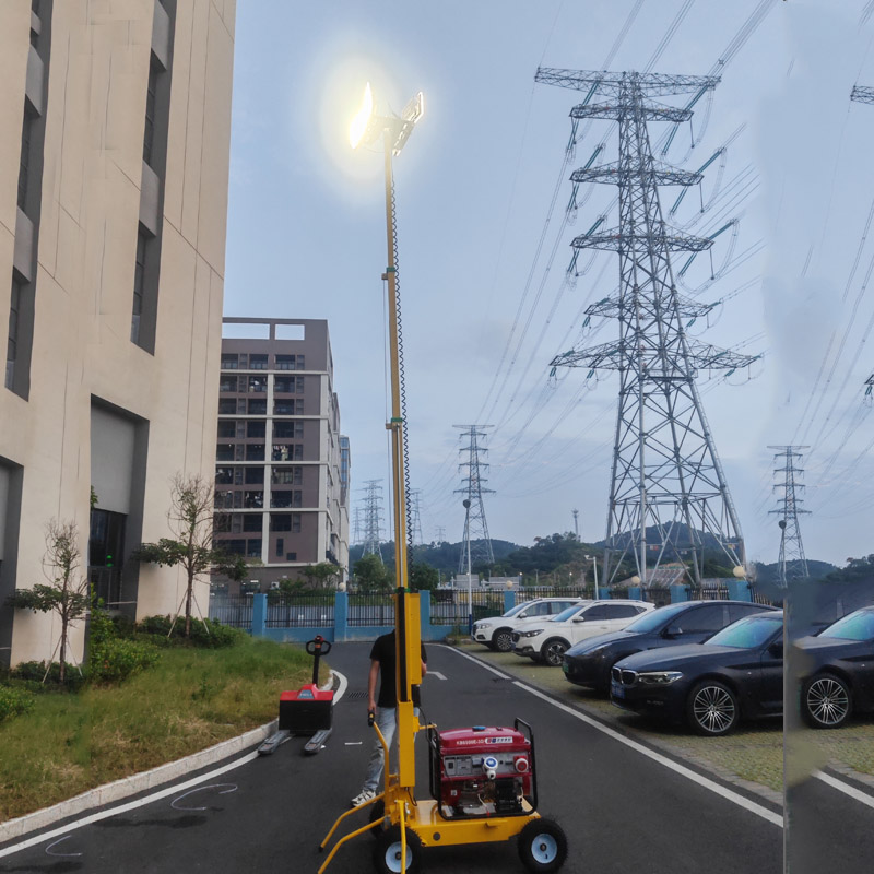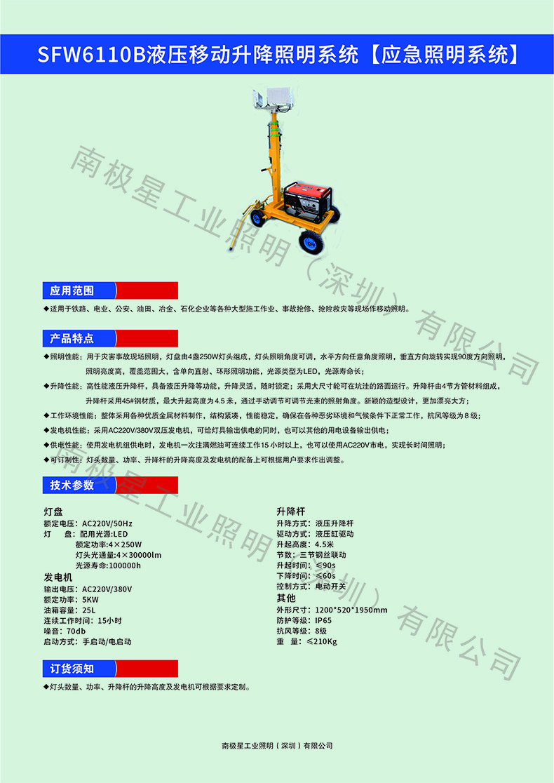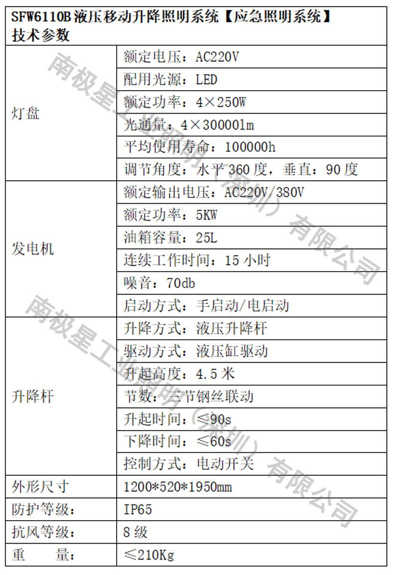 额定电压::AC220V 额定功率::4×250W 调节角度::水平360度,垂直:90度 发电机功率::5KW 连续工作时间::15小时 防护等级::IP65 抗风等级::8级 重 量::≤210Kg