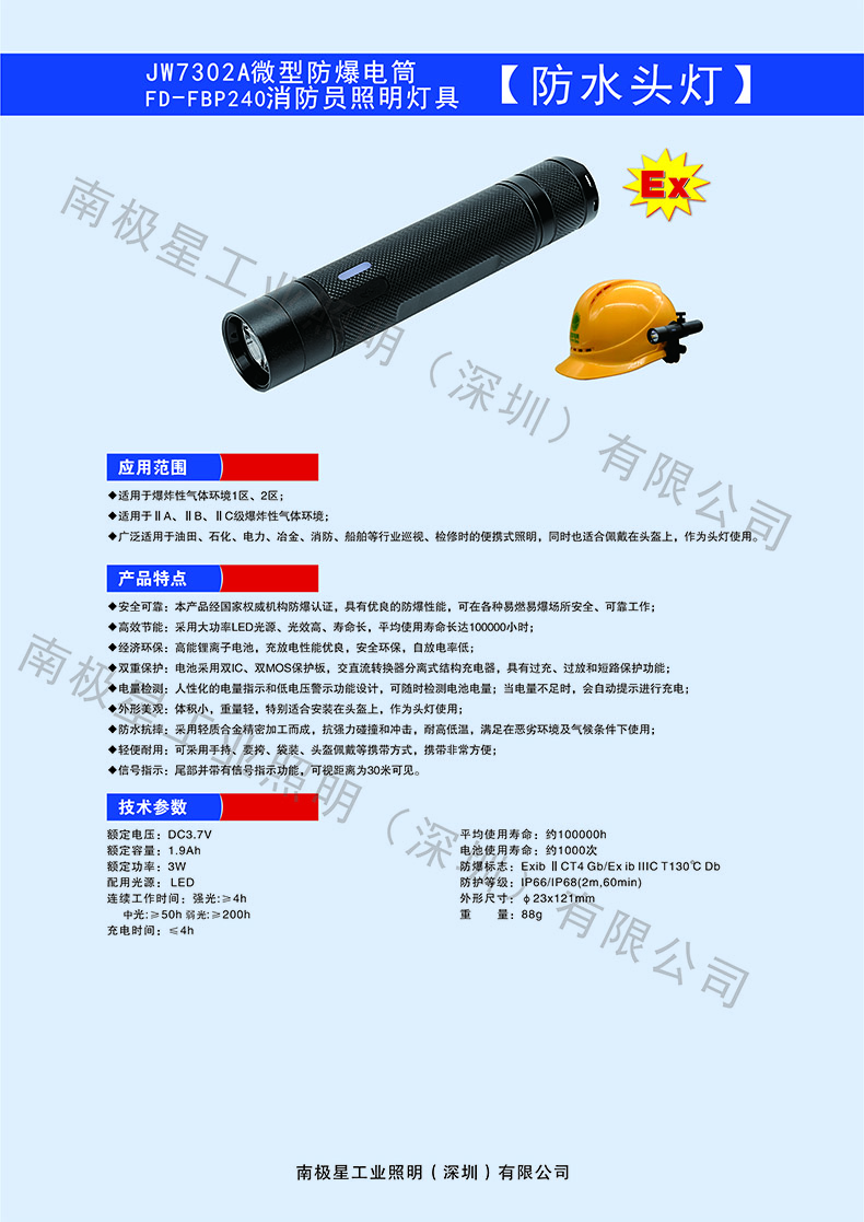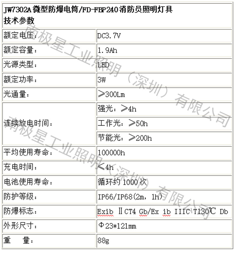 额定电压::DC3.7V 额定容量::1.9Ah 额定功率::3W 强光工作时间::≥4小时 中光工作时间::≥50h 弱光工作时间::≥200h 防护等级::IP66/IP68(2m,60min) 防爆等级::Exib ⅡCT4 Gb/Ex ib IIIC T130℃ Db