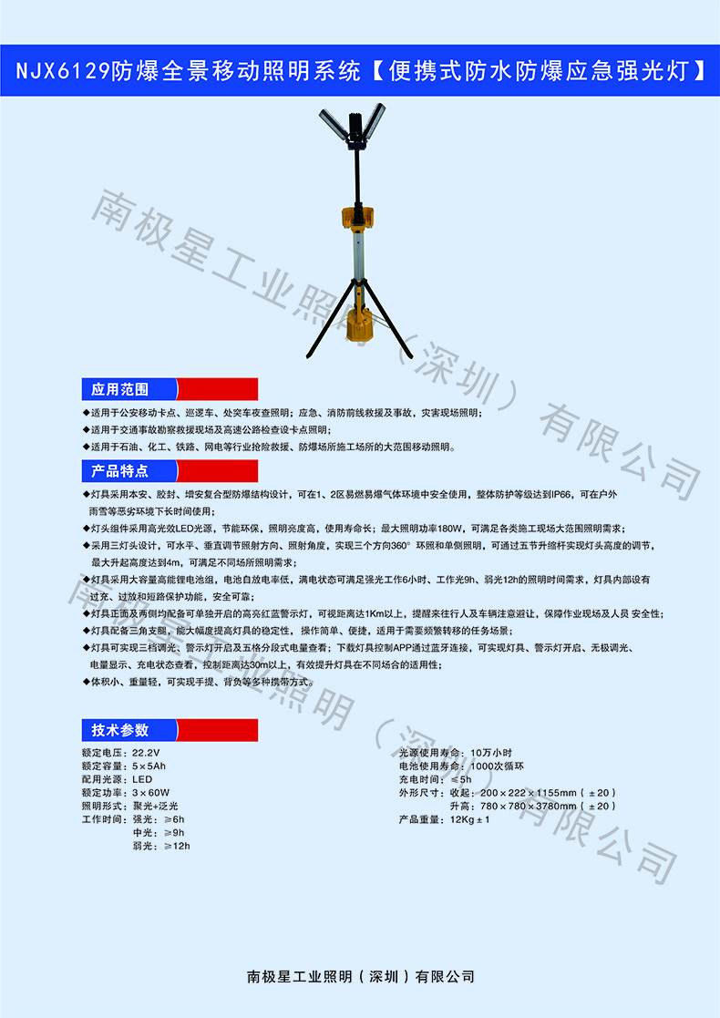 额定电压::DC22.2V 额定容量::5*5Ah 额定功率::180W 强光放电时间::7h 弱光放电时间::12h 防爆等级::Ex db eb mb IICT5 Gb 防护等级::IP66 重量::12Kg
