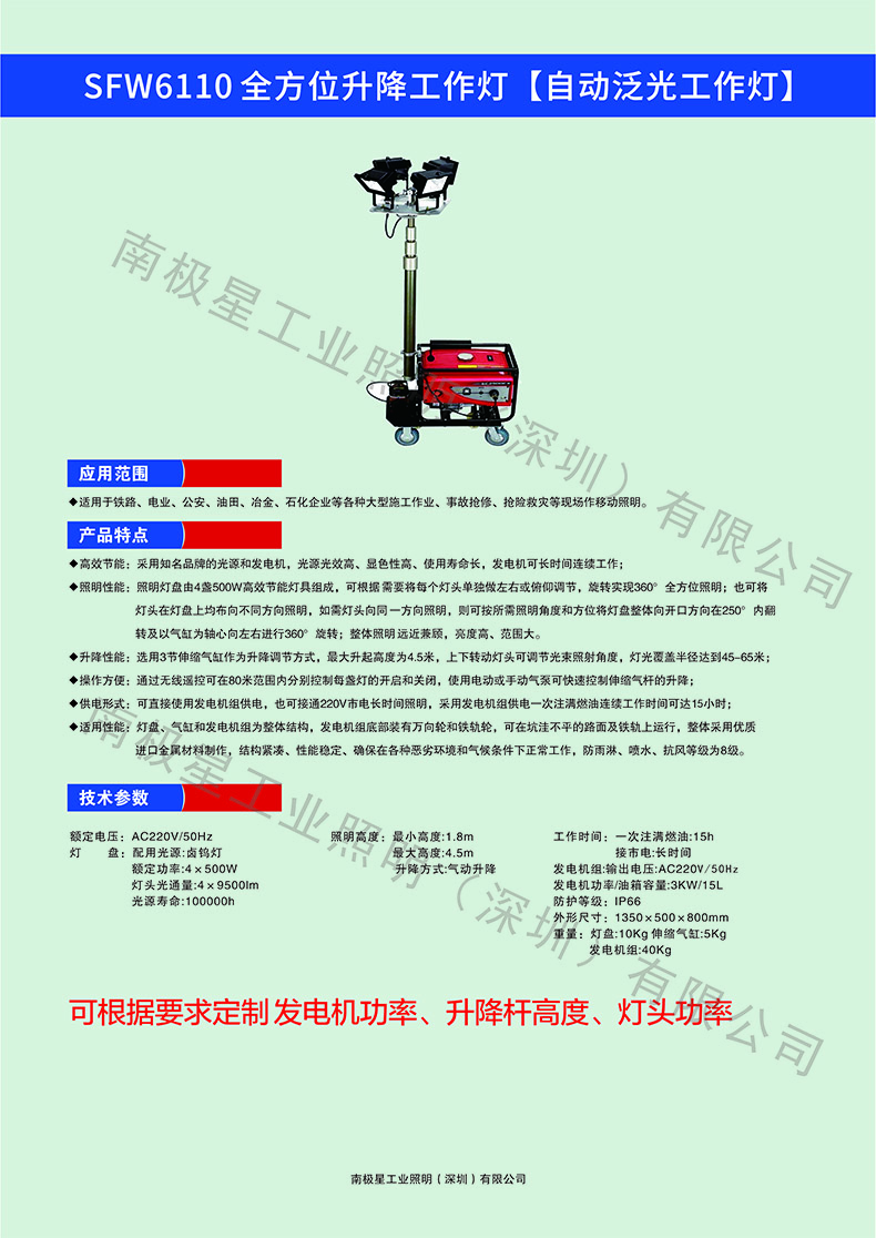 额定电压::AC220V 配用光源::卤钨灯/LED 额定功率::4×500W/4×100W 调节角度::水平360度,垂直:90度 照明功能::单向直射/环形照明 发电机功率::3KW/5KW 升降高度::4.5米/6米 抗风等级::8级