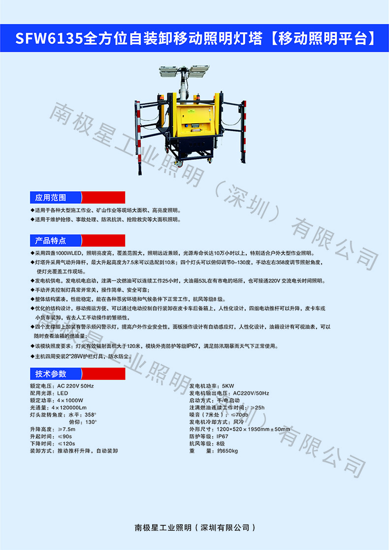 额定电压::AC220V 50Hz 额定功率::4×1000W 调节角度::水平358度,垂直:130度 升降高度::7.5米 防护等级::IP67 抗风等级::8级 装卸方式::推动推杆升降,自动装卸 重 量::≤650Kg